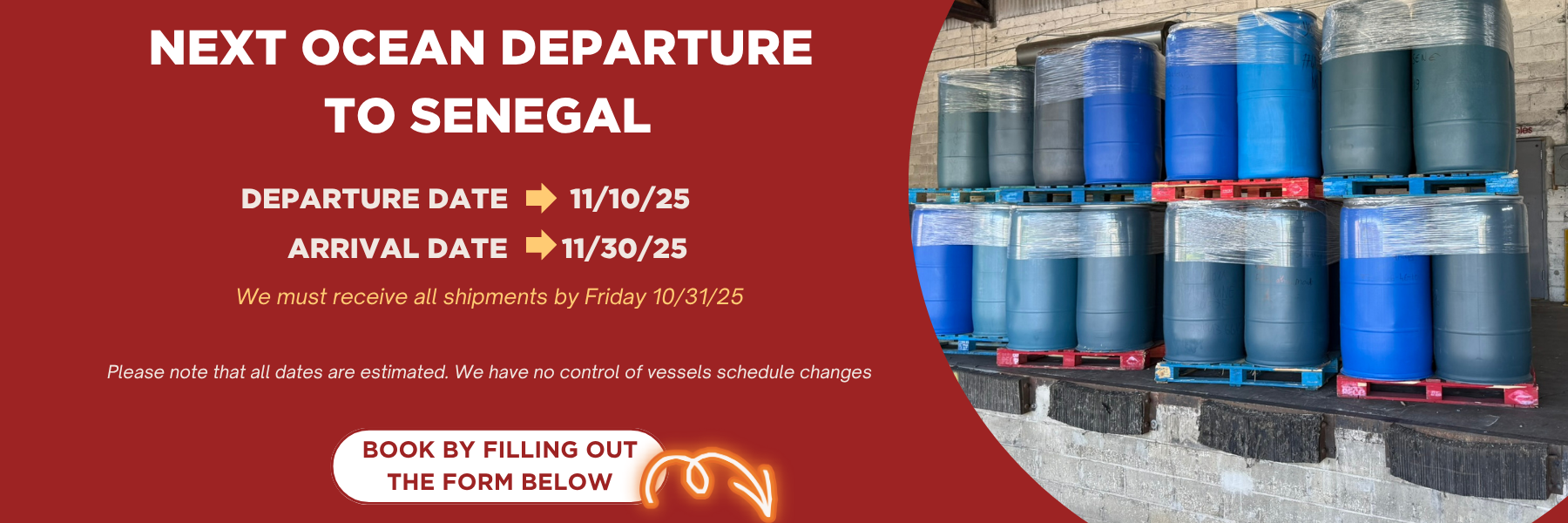 Fill out the form below to reserve your Ocean Freight Shipment Step 1 of 2 50% Name* First Last Phone*Email* Address* Street Address Address Line 2 City State / Province / Region ZIP / Postal Code Country AfghanistanAlbaniaAlgeriaAmerican SamoaAndorraAngolaAnguillaAntarcticaAntigua and BarbudaArgentinaArmeniaArubaAustraliaAustriaAzerbaijanBahamasBahrainBangladeshBarbadosBelarusBelgiumBelizeBeninBermudaBhutanBoliviaBonaire, Sint Eustatius and SabaBosnia and HerzegovinaBotswanaBouvet IslandBrazilBritish Indian Ocean TerritoryBrunei DarussalamBulgariaBurkina FasoBurundiCabo VerdeCambodiaCameroonCanadaCayman IslandsCentral African RepublicChadChileChinaChristmas IslandCocos IslandsColombiaComorosCongoCongo, Democratic Republic of theCook IslandsCosta RicaCroatiaCubaCuraçaoCyprusCzechiaCôte d'IvoireDenmarkDjiboutiDominicaDominican RepublicEcuadorEgyptEl SalvadorEquatorial GuineaEritreaEstoniaEswatiniEthiopiaFalkland IslandsFaroe IslandsFijiFinlandFranceFrench GuianaFrench PolynesiaFrench Southern TerritoriesGabonGambiaGeorgiaGermanyGhanaGibraltarGreeceGreenlandGrenadaGuadeloupeGuamGuatemalaGuernseyGuineaGuinea-BissauGuyanaHaitiHeard Island and McDonald IslandsHoly SeeHondurasHong KongHungaryIcelandIndiaIndonesiaIranIraqIrelandIsle of ManIsraelItalyJamaicaJapanJerseyJordanKazakhstanKenyaKiribatiKorea, Democratic People's Republic ofKorea, Republic ofKuwaitKyrgyzstanLao People's Democratic RepublicLatviaLebanonLesothoLiberiaLibyaLiechtensteinLithuaniaLuxembourgMacaoMadagascarMalawiMalaysiaMaldivesMaliMaltaMarshall IslandsMartiniqueMauritaniaMauritiusMayotteMexicoMicronesiaMoldovaMonacoMongoliaMontenegroMontserratMoroccoMozambiqueMyanmarNamibiaNauruNepalNetherlandsNew CaledoniaNew ZealandNicaraguaNigerNigeriaNiueNorfolk IslandNorth MacedoniaNorthern Mariana IslandsNorwayOmanPakistanPalauPalestine, State ofPanamaPapua New GuineaParaguayPeruPhilippinesPitcairnPolandPortugalPuerto RicoQatarRomaniaRussian FederationRwandaRéunionSaint BarthélemySaint Helena, Ascension and Tristan da CunhaSaint Kitts and NevisSaint LuciaSaint MartinSaint Pierre and MiquelonSaint Vincent and the GrenadinesSamoaSan MarinoSao Tome and PrincipeSaudi ArabiaSenegalSerbiaSeychellesSierra LeoneSingaporeSint MaartenSlovakiaSloveniaSolomon IslandsSomaliaSouth AfricaSouth Georgia and the South Sandwich IslandsSouth SudanSpainSri LankaSudanSurinameSvalbard and Jan MayenSwedenSwitzerlandSyria Arab RepublicTaiwanTajikistanTanzania, the United Republic ofThailandTimor-LesteTogoTokelauTongaTrinidad and TobagoTunisiaTurkmenistanTurks and Caicos IslandsTuvaluTürkiyeUS Minor Outlying IslandsUgandaUkraineUnited Arab EmiratesUnited KingdomUnited StatesUruguayUzbekistanVanuatuVenezuelaViet NamVirgin Islands, BritishVirgin Islands, U.S.Wallis and FutunaWestern SaharaYemenZambiaZimbabweÅland Islands Select the cargo you're reserving*Please note that we must receive all shipments by 10/31/25 ETD (estimated time of departure) ETA (estimated time of arrival) CARGO DEPARTURE 11/10 >>> ETA 11/30/25 Packaging Type*If the packaging type is not listed, please choose other.BarrelWardrobe Box (XXlarge / Tall Uhaul)Small boxMedium boxLarge boxSuitcaseCarry on suitcaseBagMedium binLarge binFlat screen TVAdult bikeKids bikeCratePalletLiving room setBedroom setDining room setFridgeTiresEngineOtherEnter Package TypePackageDescription Enter Quantity*Please enter a number greater than or equal to 1.Description of goods*For customs declaration, list the items in your shipment. Please be as specific as possible, If you have a packing list, you can upload it below.Are you shipping more packages?YesNoList your additional shipmentsItemQuantityDescription If you have a packing list, pictures or videos, UPLOAD HEREYou have the option to upload a packing list, pictures, and videos to provide more detailed description of your shipment. Max. file size: 64 MB. What best describe your shipment?*Personal itemsCommercial itemsGiftsDonationItems of no commercial valueNone of these applyDoes your shipment contain any fabrics (Getzner, Bazin etc..) or expensive watches over $250 value?*NoYesChoose Pick up, Drop-off or Delivery*• Minimum pick-up fee: $30 • Heavy and Large Shipments: $50+ Please note that our warehouse is open Monday thru Friday 9AM - 3PM for drop offs and deliveries.Pick upDrop off at your warehouseI will have my package shipped to your warehouseChoose Pick Up DateWe will notify you if your location is not along our pick up route once we received your reservation.Bronx, NY 10/30Manhattan, NY 10/30Queens, NY 10/31Brooklyn, NY 10/31Staten Island, NY 10/31North New Jersey 10/31South and Central New Jersey 11/01Philadelphia, NY 11/01Washington DC 11/02Maryland 11/02Delaware 11/02Rhode Island, NY 11/08 *ETA 12/10Connecticut 11/08 *ETA 12/10Massachusetts 11/08 *ETA 12/10OtherEnter Pick up Date MM slash DD slash YYYY Is the pick up address different from the one noted above?NoYesProvide the pick up address Street Address City AlabamaAlaskaAmerican SamoaArizonaArkansasCaliforniaColoradoConnecticutDelawareDistrict of ColumbiaFloridaGeorgiaGuamHawaiiIdahoIllinoisIndianaIowaKansasKentuckyLouisianaMaineMarylandMassachusettsMichiganMinnesotaMississippiMissouriMontanaNebraskaNevadaNew HampshireNew JerseyNew MexicoNew YorkNorth CarolinaNorth DakotaNorthern Mariana IslandsOhioOklahomaOregonPennsylvaniaPuerto RicoRhode IslandSouth CarolinaSouth DakotaTennesseeTexasUtahU.S. Virgin IslandsVermontVirginiaWashingtonWest VirginiaWisconsinWyomingArmed Forces AmericasArmed Forces EuropeArmed Forces Pacific State ZIP Code Delivery dateLet us know when to expect your shipment delivered to our warehouse. DEADLINE FOR THIS CARGO IS FRIDAY 10/31/25 Please note that our warehouse is opened Monday thru Friday 9AM - 3PM. Please use the following address to ship your package [Your Name] c/o Sencargo 500 Nordhoff Pl SUITE 1B Englewood, NJ 07631 MM slash DD slash YYYY Drop-off dateLet us know when you will drop off your shipment at our warehouse. DEADLINE FOR THIS CARGO IS FRIDAY 10/
